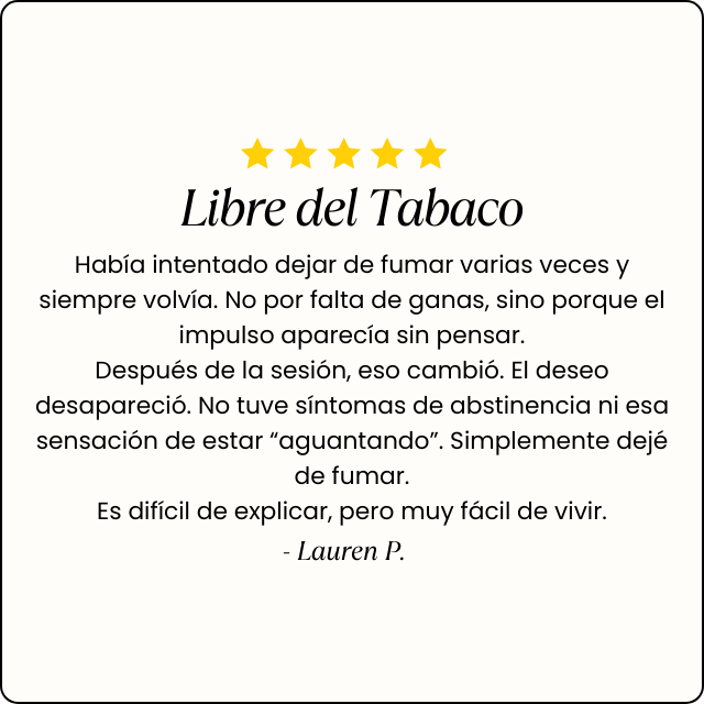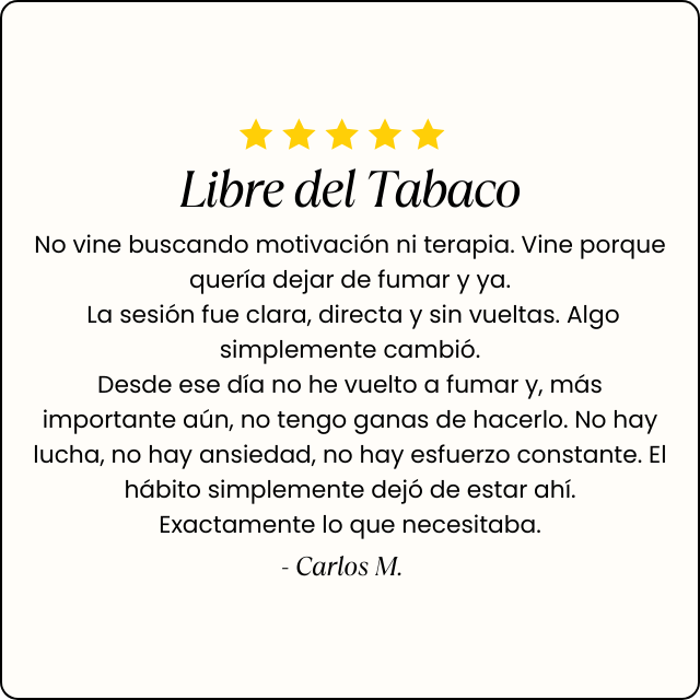 No hay lucha interna, ni ansiedad, ni abstinencia, porque no se trata de forzarte a dejar de fumar. Se trata de cambiar la programación interna que hacía que fumar fuera algo automático e impulsivo. Cuando tu mente inconsciente entiende que el cigarro ya no cumple ninguna función, el deseo simplemente desaparece.